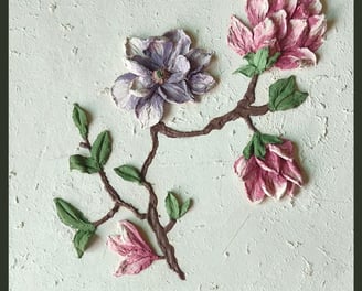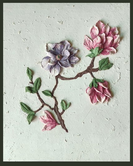 Presenting delicate Magnolia flowers brought to life through sculpture painting. The intricate details of each petal, branch, and leaf create a lifelike representation of this iconic bloom. The soft shades of pink and purple add a touch of elegance, making this piece perfect for anyone looking to add a subtle yet beautiful statement of nature to their space. Celebrate the grace and beauty of the Magnolia flowers with this exquisite artwork that radiates serenity and charm.