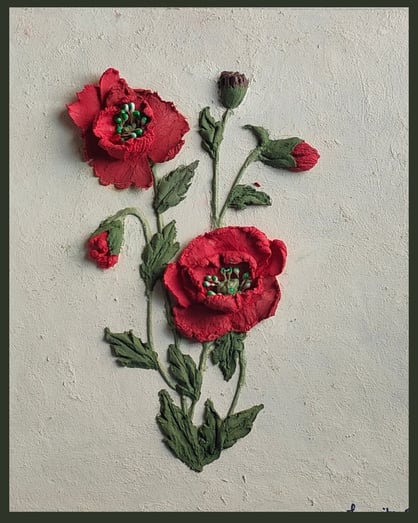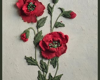 Presenting a stunning sculpture painting of vibrant red poppies, intricately textured and brought to life through delicate craftsmanship. Each petal and leaf is sculpted with precision, creating a three-dimensional effect that captures the beauty and essence of these timeless flowers. This artwork beautifully combines the softness of nature with the depth of tactile art, making it a perfect addition to your collection.