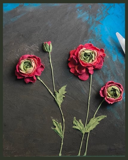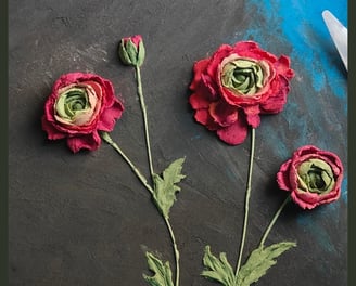 Introducing a mesmerizing sculpture painting of the vibrant Ranunculus flower, known for its layered petals and rich texture. Each bloom is meticulously sculpted to create a lifelike representation of this elegant flower, adding a stunning three-dimensional quality to the artwork. The vivid contrast between the deep reds and greens against the dark background elevates the beauty of the Ranunculus, making it a striking piece for art and nature lovers alike.